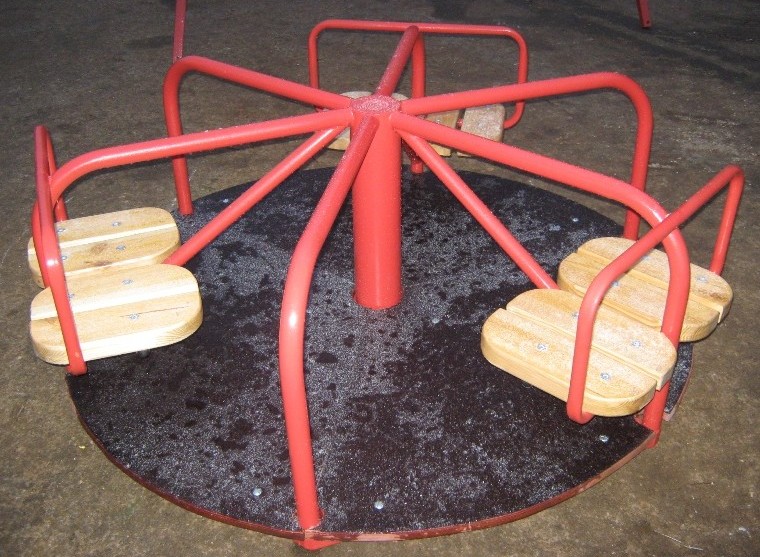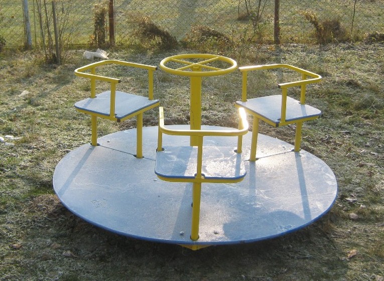 - Смотрите на функциональные особенности. Здесь есть экземпляры, предназначенные для самых маленьких посетителей площадок. Для них разработаны изделия, которые приводят в действие стоящие поблизости родители. Такой подход позволяет точно дозировать скорость вращения, избегая опасных ситуаций. Нередко клиенты предпочитают купить недорого детские карусели, оснащенные штурвалом. Система приводится в движение при помощи мышечной силы рук детей. Значительный интерес представляет модель «Забава», на которой установлены поручни, но не предусмотрены сиденья. Конструкция запускается и функционирует при отталкивании от земли ногами. Катанию стоя отдают предпочтение дети постарше, уже посещающие школу.
